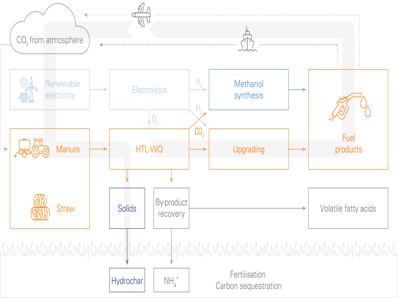 Weitere Innovationen umfassen Prozesse für die Kraftstoffaufbereitung, die zu einer hohen Kerosinausbeute führen, sowie Verwertungskonzepte für alle relevanten Nebenströme, um die Biomasse möglichst vollständig zu nutzen. Insbesondere dienen CO2-reiche Abgase als Rohstoff für eine Methanol-synthese. Weiterhin wird untersucht, ob sich Arten von HTL-Biokohle, die prozessbedingt entstehen, für eine Einbringung in Böden eignen.