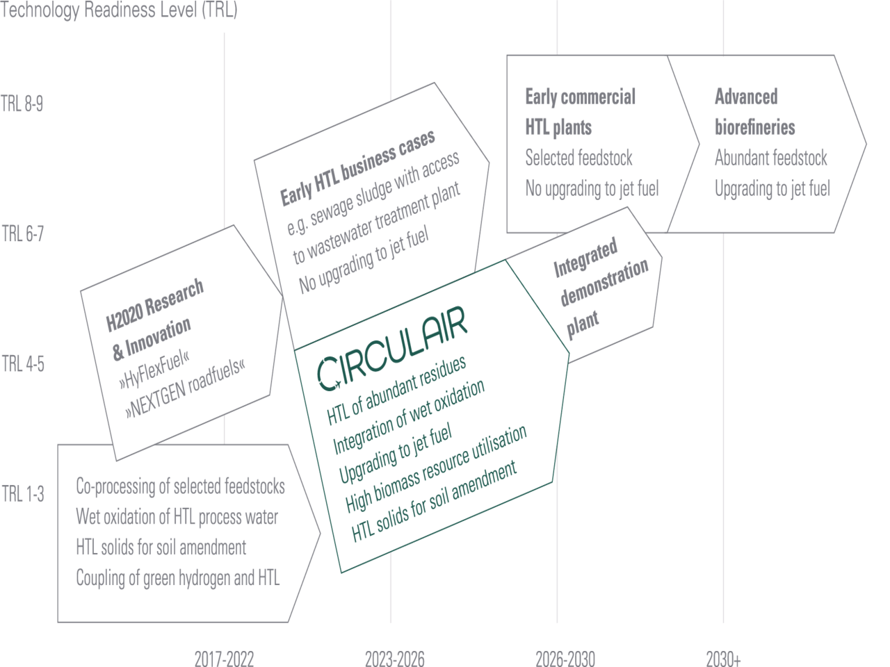 Die in CIRCULAIR entwickelten Innovationen decken die gesamte Prozesskette ab. Aktuell stellt der Umgang mit dem Prozesswasser eine Hürde für die Weiterentwicklung der HTL-Technologie dar. Diese Herausforderung wird durch die Integration der HTL mit einer Nassoxidation (wet oxidation, WO) adressiert. Die exotherme WO reinigt das Prozesswasser und liefert zudem Wärme für die HTL.