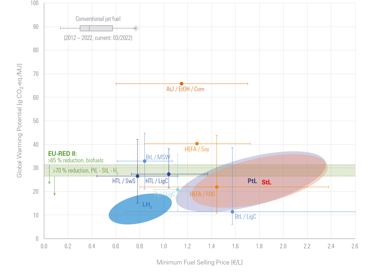 Treibhausgasemissionen und Gestehungskosten wichtiger Kraftstoffoptionen für die Luftfahrt im Vergleich zu Preisdaten für konventionelles Kerosin, ICAO-Standardwerte, welche für Treibhausgasemissionen und Mindestanforderungen aus der europäischen Erneuerbare-Energien-Richtlinie (EU-RED II). Die meisten ICAO-Standartwerte, welche für Biokraftstoffe der ersten Generation anzusetzen sind (Beispiele: AtJ aus Maisethanol, HEFA aus Sojaöl), liegen oberhalb der europäischen Mindestanforderungen für Treibhausgasreduktionen. HEFAKraftstoffe aus Reststoffen (Altöle, Fette – FOG) erfüllen in der Regel die geforderten Treibhausgaseinsparungen, aber ihr Produktionspotenzial ist aufgrund der Rohstoffverfügbarkeit limitiert. Konversionsverfahren für fortgeschrittene biogene Rohstoffe (BtL, HTL, Pyr) bieten signifikante zusätzliche Produktionspotenziale, allerdings besteht weiterhin Forschungs- und Entwicklungsbedarf, um diese fortgeschrittenen Biokraftstoffe zur Marktreife zu führen. Die zu erwartenden Kosten und Treibhausgasemissionen der synthetischen Kraftstoffe aus CO2 und H2O (PtL, StL) sowie für LH2 hängen stark von den vorhandenen Potenzialen an erneuerbaren Energien am Produktionsstandort ab. Die Bereitstellung von LH2 ist an einem gegebenen Standort (ohne Transport) mit deutlich geringeren Kosten und Emissionen verbunden als die Herstellung synthetischer Kraftstoffe, da der Umwandlungswirkungsgrad höher ist und die Kerosinsynthese zusätzlich eine Kohlenstoffquelle benötigt.
