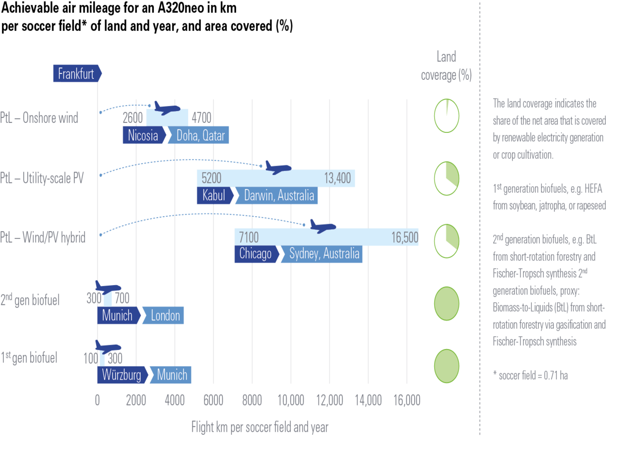 Das aktualisierte Hintergrundpapier diskutiert unter anderem PtL-Herstellungsrouten, Ressourcenbedarfe und Produktionspotenziale. So muss, um PtL-Kraftstoffe nachhaltig in großen Mengen herzustellen, überwiegend auf Sonnen- und Windenergie zurückgegriffen werden. Es zeigt sich, dass dann das technische Produktionspotenzial in Europa den europäischen Kraftstoffbedarf der Luftfahrt etwa um das Zehnfache übersteigt. Trotz erheblicher Kostensenkungspotenziale bleiben PtLKraftstoffe auch längerfristig mit 1170 – 1740 €/t vergleichsweise teuer, allerdings fällt der Ressourcenverbrauch in Bezug auf Wasser- und Landbedarf deutlich geringer aus als bei Kraftstoffen aus Anbaubiomasse.