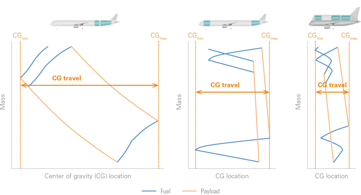 Die Verlagerung des Schwerpunkts für alle möglichen Passagier- / Kraftstoffkombinationen ist ein entscheidender Entwurfsaspekt und wird in erster Linie durch die Tankplatzierung bestimmt. Die Verschiebung beeinflusst Aspekte wie Trimmwiderstand, Flügel- / Fahrwerkspositionen und Leitwerkgröße.