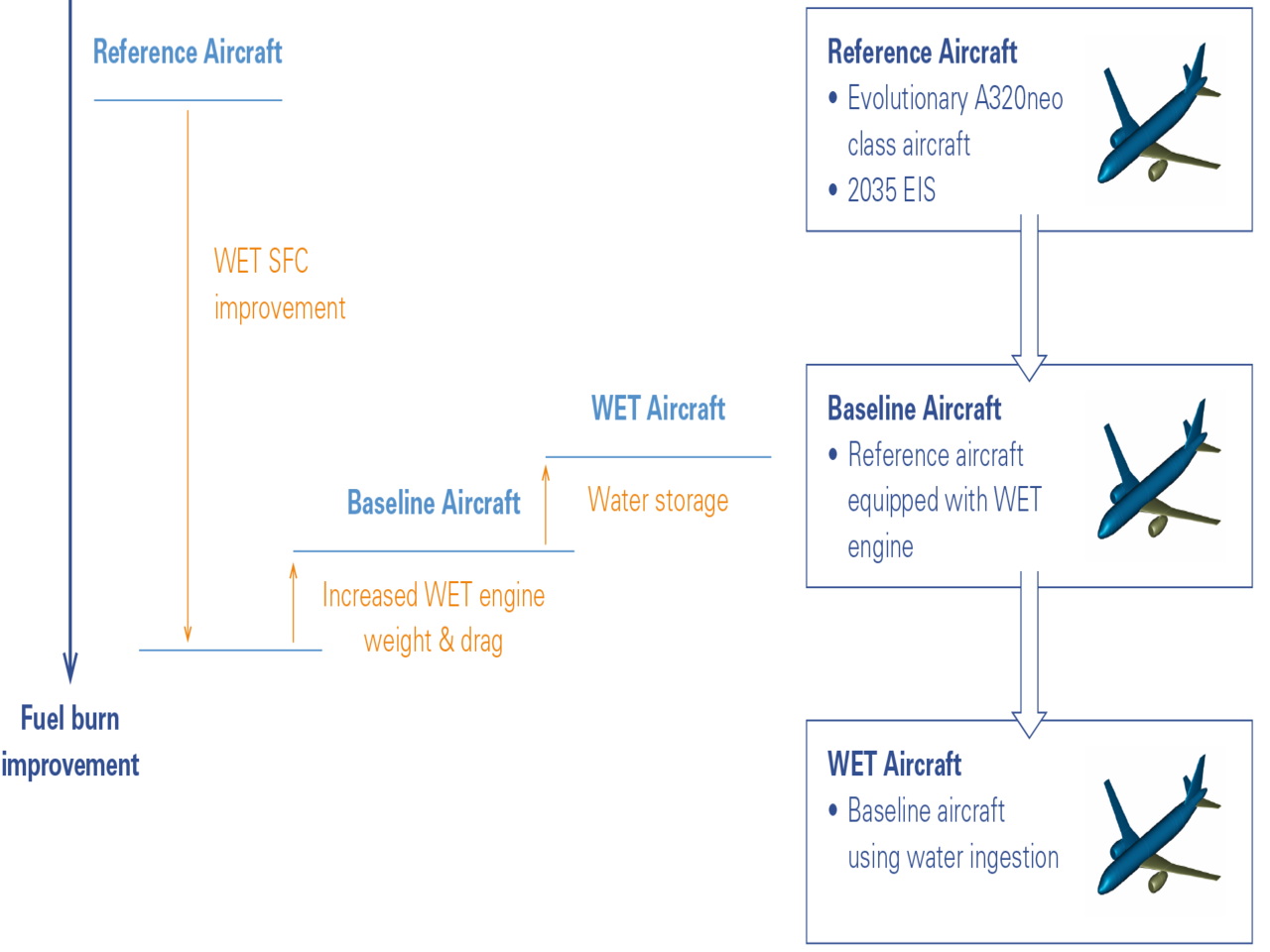 Diese Bewertungsfähigkeit wurde am Bauhaus Luftfahrt aufgebaut und für eine erste Auswertung bezogen auf eine typische Mittelstreckenflugzeuganwendung angewandt. Weitere Arbeiten zur Optimierung der Bewertungsmethodik sowie der flugzeugintegrierten WET-Antriebsauslegung stehen noch aus und deuten auf ein Potenzial von 10 % geringerem Treibstoffverbrauch hin.