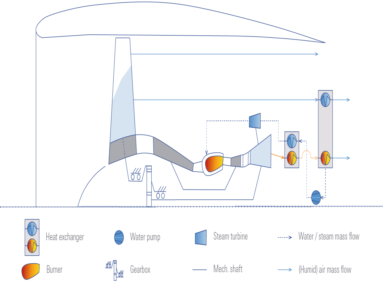 Das flüssige Wasser wird mit geringem Energieaufwand hoch bedruckt, anschließend verdampft und in einer Dampfturbine auf das benötigte Druckniveau zur Einspritzung in die Brennkammer des Getriebefans entspannt. Die Dampfeinspritzung bewirkt eine drastische Reduktion der Stickoxidemissionen. Die benötigte Verdampfungswärme wird dem Abgasstrahl entnommen, während die Kondensationswärme dem Nebenstrom zugeführt wird. Auf diese Weise entsteht ein äußerst effizientes Flugantriebskonzept mit geringen Stickoxidemissionen. Bei steigender Effizienz vergrößern sich Volumen und Gewicht des Antriebes signifikant aufgrund der Wärmeüberträger, was einen entscheidenden Einfluss auf die Anwendung im Flugzeug hat. Zusätzlich wird in niedrigen Flughöhen wegen der höheren Umgebungstemperaturen eine externe Wasserzufuhr benötigt. Das macht ein angepasstes Flugzeugdesign sowie eine Bewertung des Antriebskonzeptes auf Missionsebene notwendig.