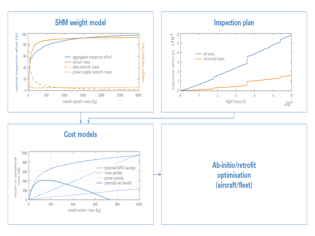 Strukturüberwachung (SHM) mittels Sensornetzwerken ermöglicht es, den manuellen Inspektionsaufwand von Luftfahrzeugen zu reduzieren. Dieser ist sowohl komponenten- als auch nutzungsabhängig und steigt mit dem Flugzeugalter an. Da ein dediziertes SHM-System Gewicht und Leistungsbedarf des Flugzeuges erhöht, stellt sich zum einen die Frage, für welche spezifischen Komponenten sich eine Überwachung lohnen könnte, und zum anderen, ob eine Nachrüstung im späteren Leben – im Vergleich zur reinen Werksinstrumentierung – höhere Kosteneinsparungen erlaubt.