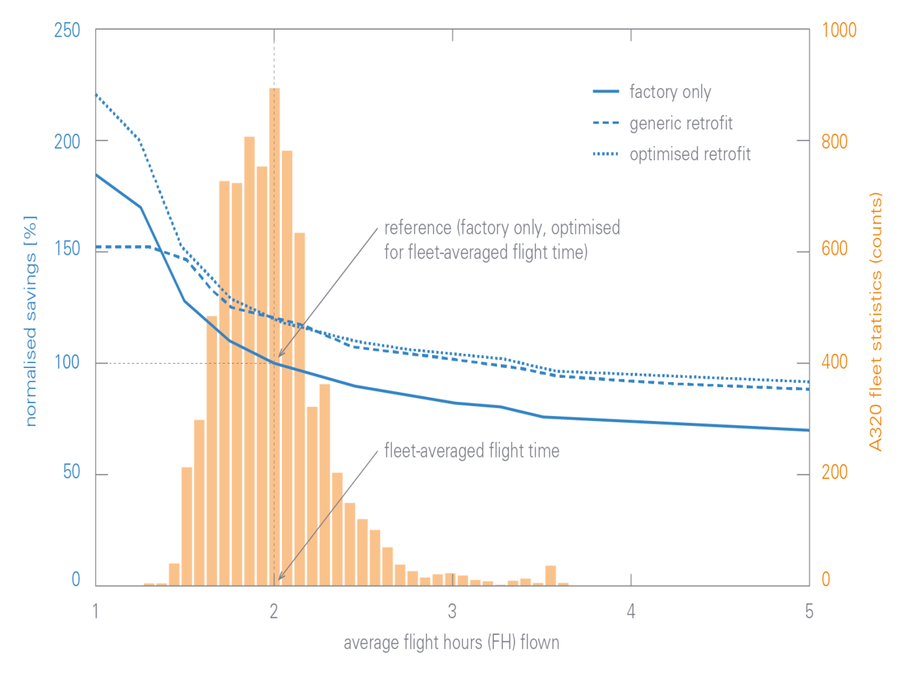 Eine nutzungsoptimierte Nachrüstung („optimised retrofit“) ist immer deutlich besser als eine reine Werksinstrumentierung („factory only“), ein flottengleicher Retrofit („generic retrofit“) zwar nicht auf der Kurzstrecke, jedoch auf Flottenebene.