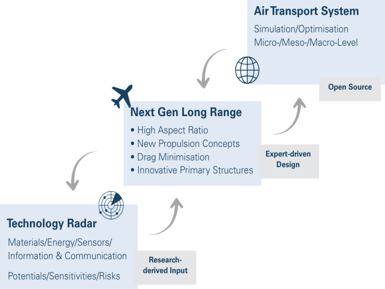 - die Ableitung transparenter, umsetzungsorientierter Empfehlungen zu Technologien, deren Kombination sowie daraus resultierenden Luftfahrzeugkonzepten für die nächste Generation von Langstreckenflugzeugen mit Entry-into-Service 2040–2045, und