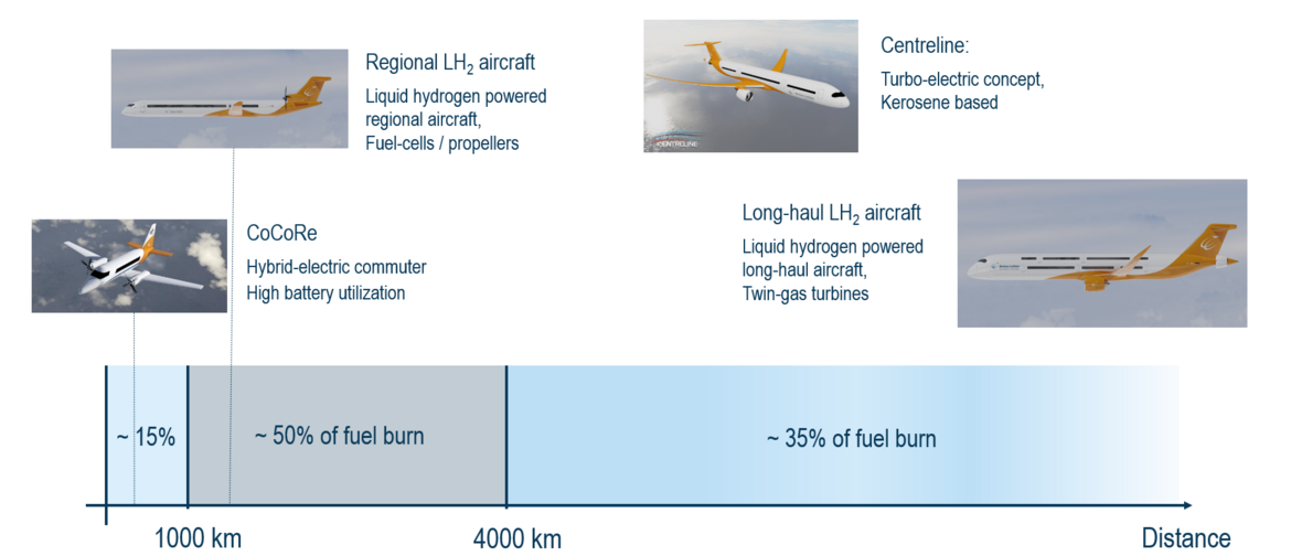 Beyond emissions savings through more efficient kerosene-powered aircraft, alternative energy carriers such as batteries or hydrogen offer significant potential for reducing the impact on the climate. Battery-electric powertrains have significantly higher conversion efficiencies than internal combustion engines. This particularly applies to low performance classes that are typically used in general aviation or regional air traffic. Electric motors suitable for air travel and the associated power electronics are at an advanced stage of development, with a power-to-weight ratio that makes them eligible for widespread use in aviation. In principle, batteries also offer sufficient power capacity, however, the energy density limits the retrieval of the required power to relatively short time intervals. That is why battery-electric flying will still be restricted to short flight distances for the foreseeable future. As outlined in Figure 1, the majority of the current fuel consumption occurs on routes that will also require energy-dense fuel in the future.