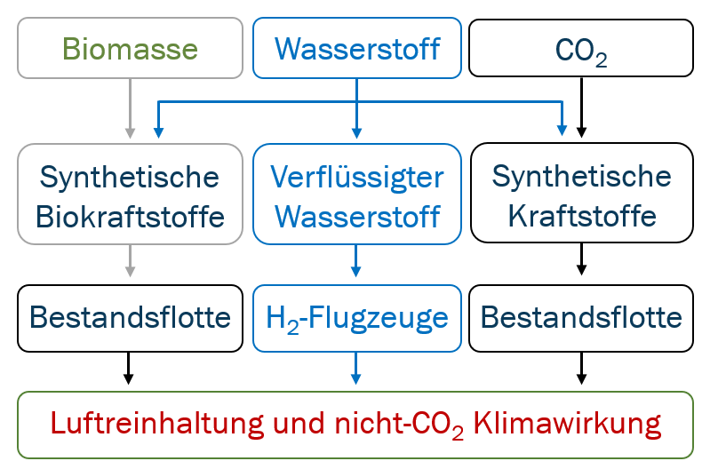 Jenseits von Emissionseinsparungen durch effizientere kerosinbetriebene Flugzeuge bieten alternative Energieträger wie Batterien oder Wasserstoff erhebliche Potentiale, die Klimawirkung zu reduzieren. Batterieelektrische Antriebe weisen wesentlich höhere Umwandlungseffizienzen auf als Verbrennungskraftmaschinen. Dies gilt insbesondere für geringe Leistungsklassen, die typischerweise in der allgemeinen Luftfahrt oder im regionalen Flugverkehr zum Einsatz kommen. Flugtaugliche Elektromotoren und die zugehörige Leistungselektronik befinden sich in einem fortgeschrittenen Entwicklungsstand, der sich in Bezug auf das Leistungsgewicht für einen breiten Einsatz im Luftverkehr eignet. Im Prinzip bieten auch Batterien ein ausreichendes Leistungsvermögen, allerdings schränkt die Energiedichte den Abruf der benötigten Leistung auf relativ kurze Zeitintervalle ein. Dadurch bleibt das batterieelektrische Fliegen auf absehbare Zeit auf kurze Flugdistanzen limitiert. Der Großteil des aktuellen Kraftstoffverbrauchs fällt auf Strecken an, die auch in Zukunft einen energiedichten Kraftstoff erfordern.
