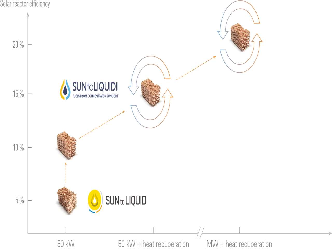 This project builds on the achievements of its predecessors SOLAR-JET and SUN-to-LIQUID. SUN-to-LIQUID II aims to demonstrate the viability of the integrated solar fuel pathway on a 50-kW scale. The primary objective is to achieve a record-high solar-to-syngas energy conversion of 15 % by bringing novel concepts and lab-scale developments (technology readiness level TRL 2 – 3) to the field (TRL 4 – 5). The project aims to optimize the high-flux solar concentrating heliostat and tower system, develop and integrate novel 3D-structured reactants, and implement high-temperature heat recovery. Future scale-up is investigated by detailed system analyses that will create a conceptual design of a next-generation commercial multi-megawatt-scale solar plant to evaluate life-cycle emissions, cost, and commercial viability.