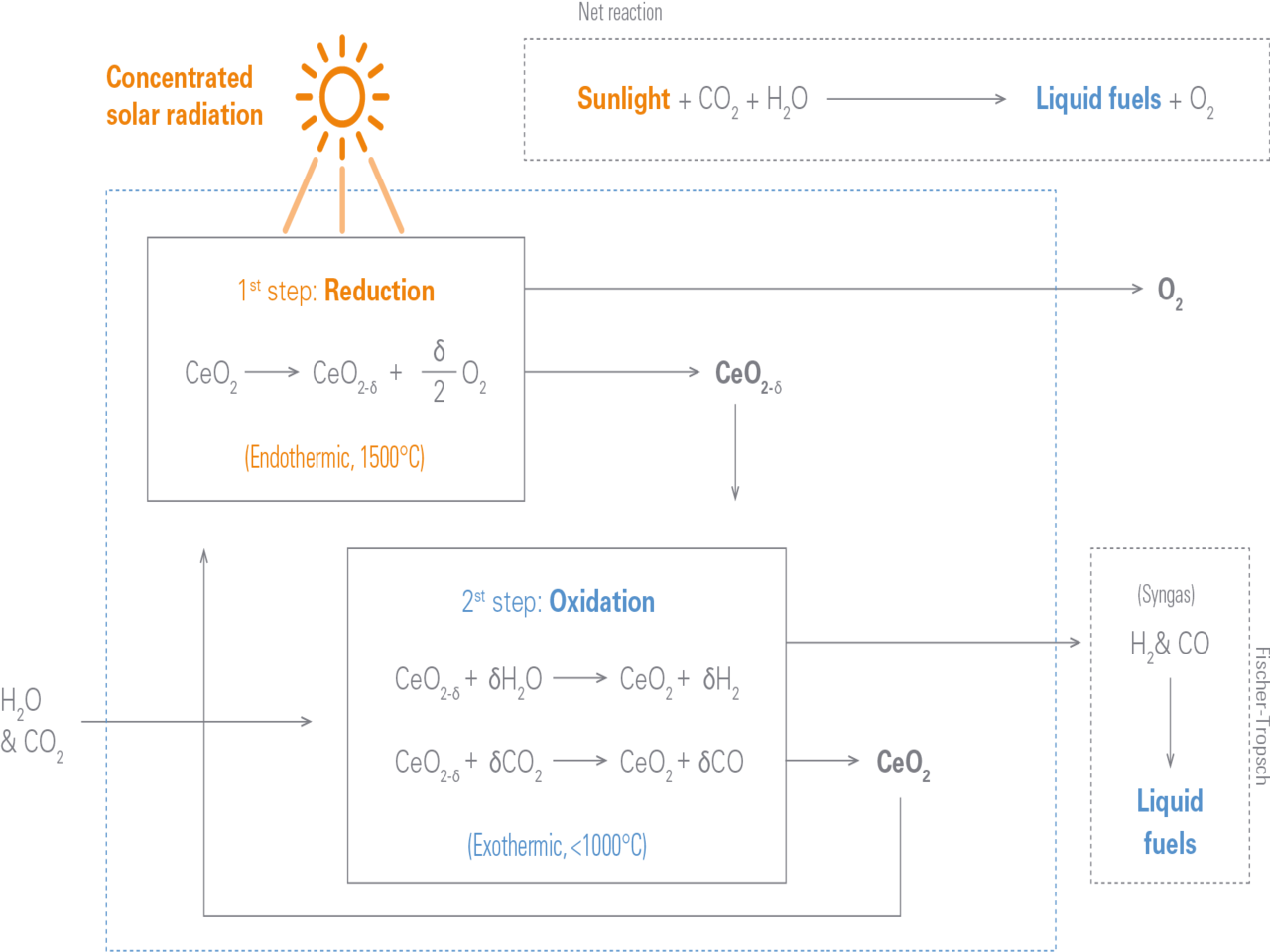 Schematic of a redox cycle which stores concentrated solar energy in liquid hydrocarbon fuels produced from H2O and CO2. This reversal of combustion is accomplished via a two-step thermochemical cycle at high temperatures.