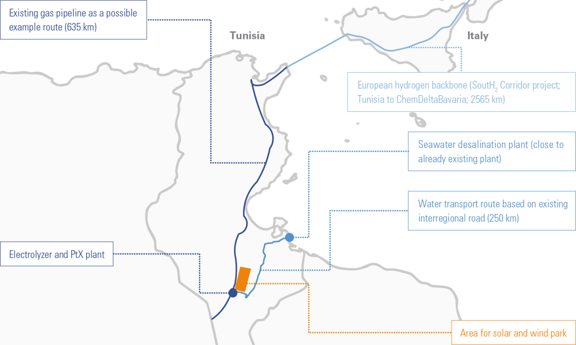 easily transported over long distances, while importing hydrogen via pipeline may also be viable if costs are shared by different sectors. The SouthH2 Corridor pipeline project, scheduled to commence operation by 2030, may represent a pivotal development for Bavarian refineries. It will be part of the European Hydrogen Backbone and extends from Tunisia via Italy and Austria to refinery sites in Burghausen and Ingolstadt. The entry point in Tunisia was selected as the common production site; if hydrogen and methanol are imported, kerosene synthesis is assumed to take place in Bavaria via methanol-to-jet (MtJ) conversion. Finally, the production costs of different scenarios were analyzed.