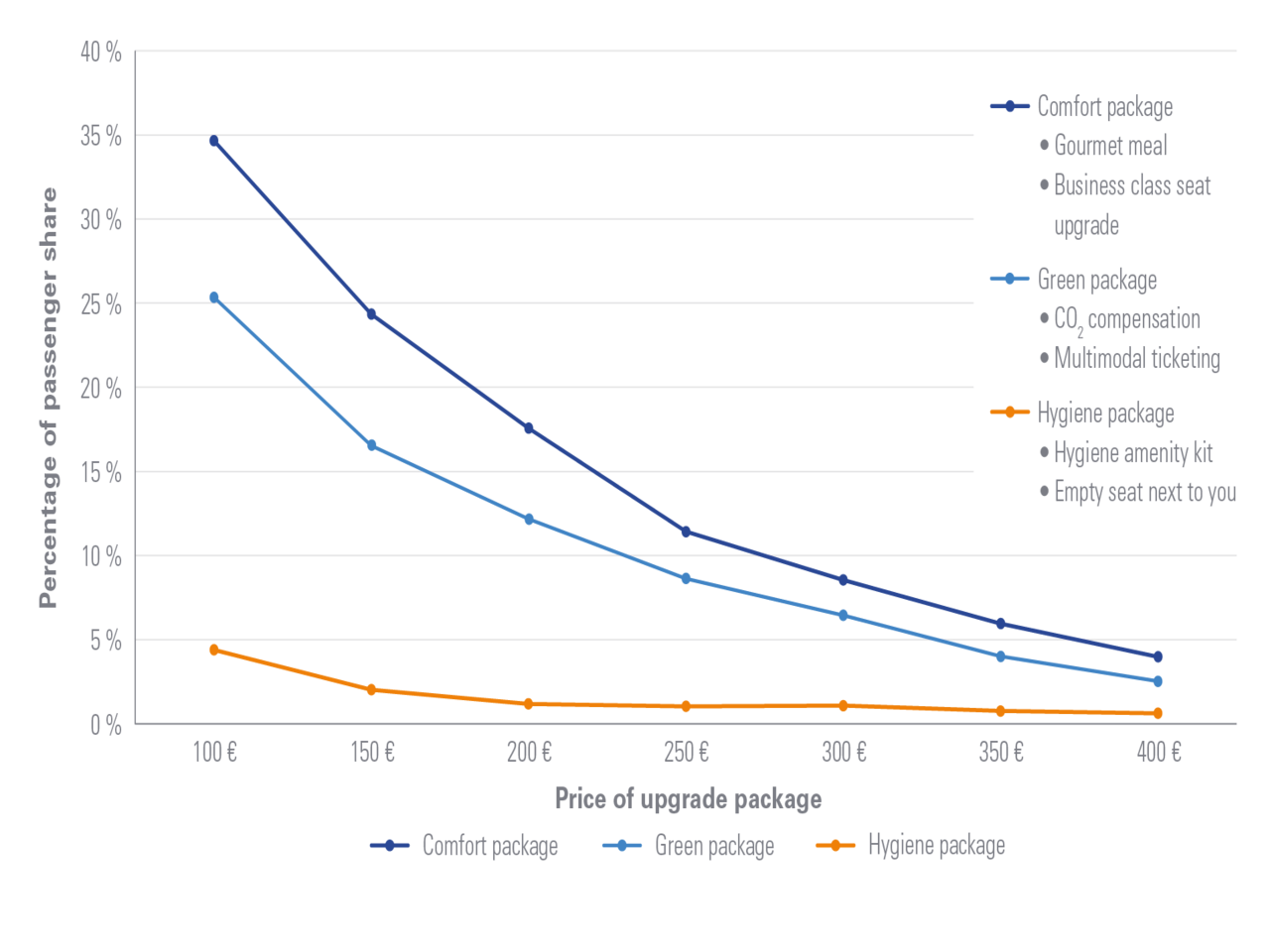 The results show that the price of additional services still has the highest relevance for passengers, followed by a seat upgrade for more comfort. Especially female and elderly passengers perceive the CO2 compensation as an attractive ancillary service. Additional hygiene-related services, such as seat disinfection or hygiene amenity products, were hardly chosen and seem to provide fewer benefits. As previous studies have already confirmed, high-yield business passengers and frequent flyers continue to attach great importance to their comfort in the cabin.