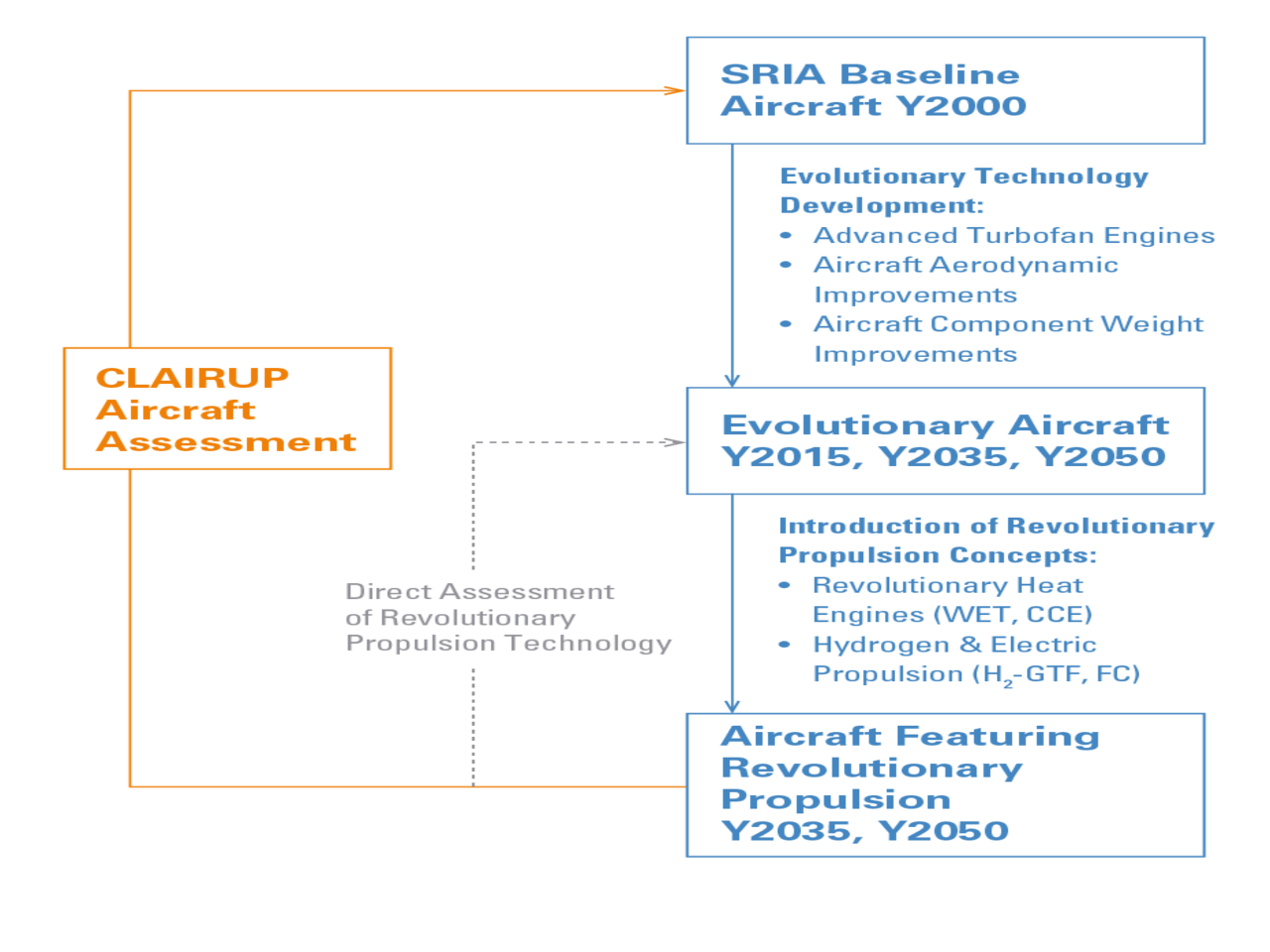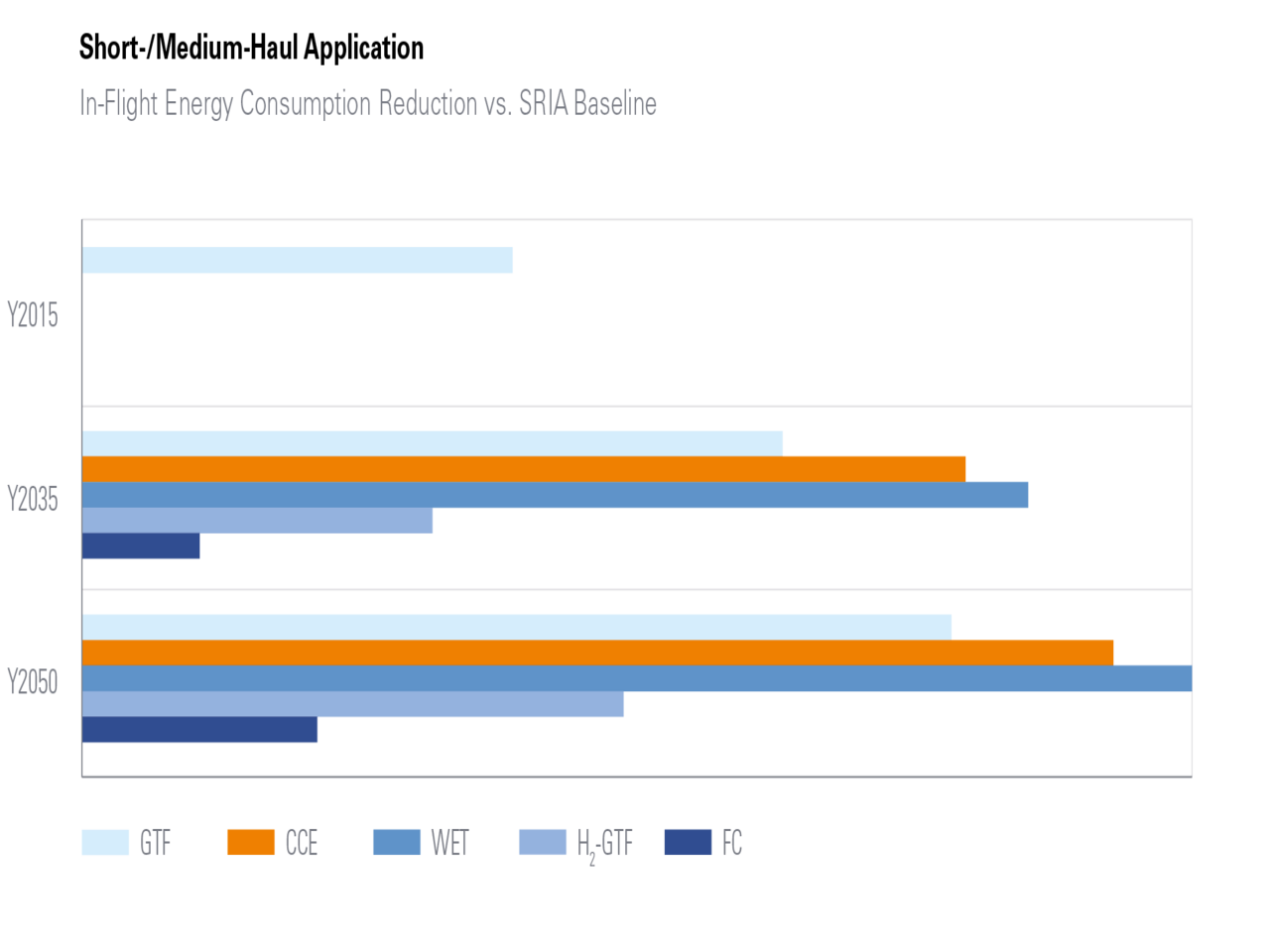 Aircraft sizes studied included a regional, a short-/medium-haul, and a long-haul aircraft. Technological developments were estimated up to the year 2050, whereby the respective entry into service was specifically selected depending on the propulsion concept. A highly simplified, statistically based aircraft design was used. The evolutionary development of conventional aircraft technology aspects (e.g. drag and weight reduction) was priced in by expected annual improvement rates. Novel aircraft components (e.g. hydrogen tanks) were incorporated through appropriate simplified methods. The performance data of the propulsion systems were determined partly by MTU Aero Engines and partly by Bauhaus Luftfahrt. The H2 concepts experience disadvantages in the aircraft structure and aerodynamic performance due to the integration of an H2 storage tank, while the FC concept additionally experiences increased complexity due to the integration of heat dissipation. The greatest energy savings were identified in the revolutionary turbomachinery.