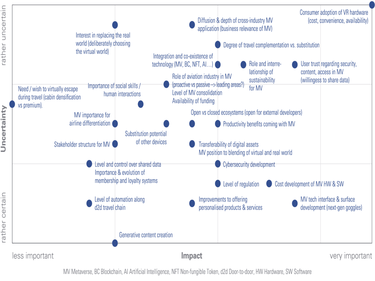 27 factors ranging from economics, politics, regulations, technology, airline and airports, passengers and society were identified. Factors with high possible impact on the travel and aviation industry, and with a high degree of uncertainty regarding future evolution, were selected to form the basis for future metaverse scenarios.