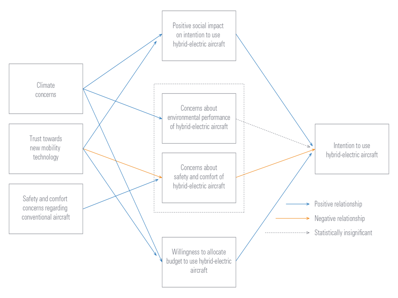 Passengers’ climate concerns, trust towards new mobility technology, as well as safety and comfort concerns about conventional aircraft may have significant indirect impacts on the intention to accept hybrid-electric aircraft.
