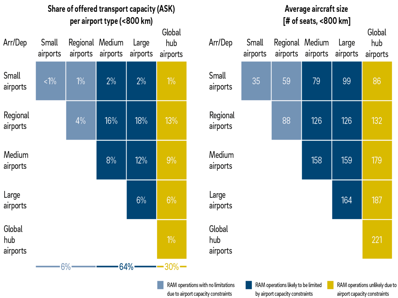 The 19-seater market has steadily decreased since the mid-1990s, mainly due to large, low-cost airlines outperforming regional operators. Over the last three decades, these airlines have increasingly added new, more efficient narrow-body aircraft to their fleets, flying them from regional to medium airports. In the case of competitive total operating costs for RAM vehicles compared to conventional aviation, some existing demand for large commercial short-haul flights could be shifted to RAM. However, the contribution to reducing aviation’s climate impact is rather limited. Only 2 % of aviation’s global transport capacity, as a proxy of direct emissions, is offered on routes shorter than 400 km, increasing to 10 % on routes up to 800 km. A move towards smaller, 19-seater aircraft would result in significantly more air traffic to achieve the same transport capacity. Currently, there is no incentivisation for highly constrained airports to consider smaller aircraft, hence small and regional airports would be best positioned to serve extra flights due to their underutilisation.